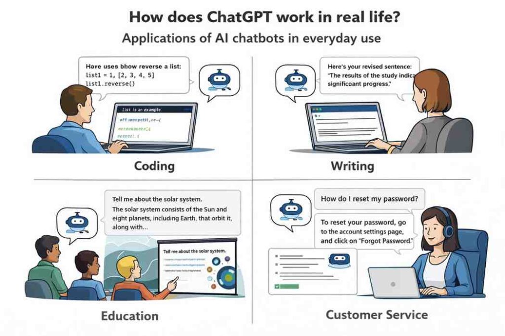 Q1: How does ChatGPT work in simple terms? ChatGPT works by reading your text, breaking it into small chunks called tokens, passing those tokens through dozens of layers of a neural network that weighs the relationship between all the words, and then predicting — one token at a time — the most appropriate next word until a full response is formed.
