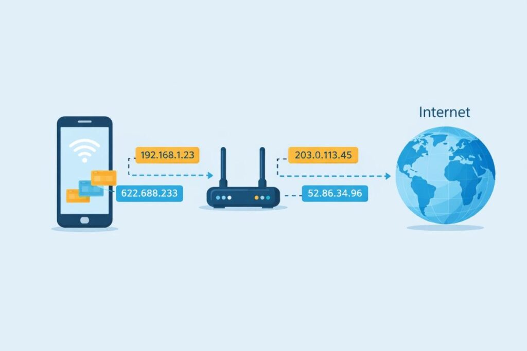 ๐ŸŽจ AI Prompt: “A clean flat-design infographic showing a smartphone sending data packets through a router to a globe representing the internet, with IP address labels floating along the path, on a light blue background.”